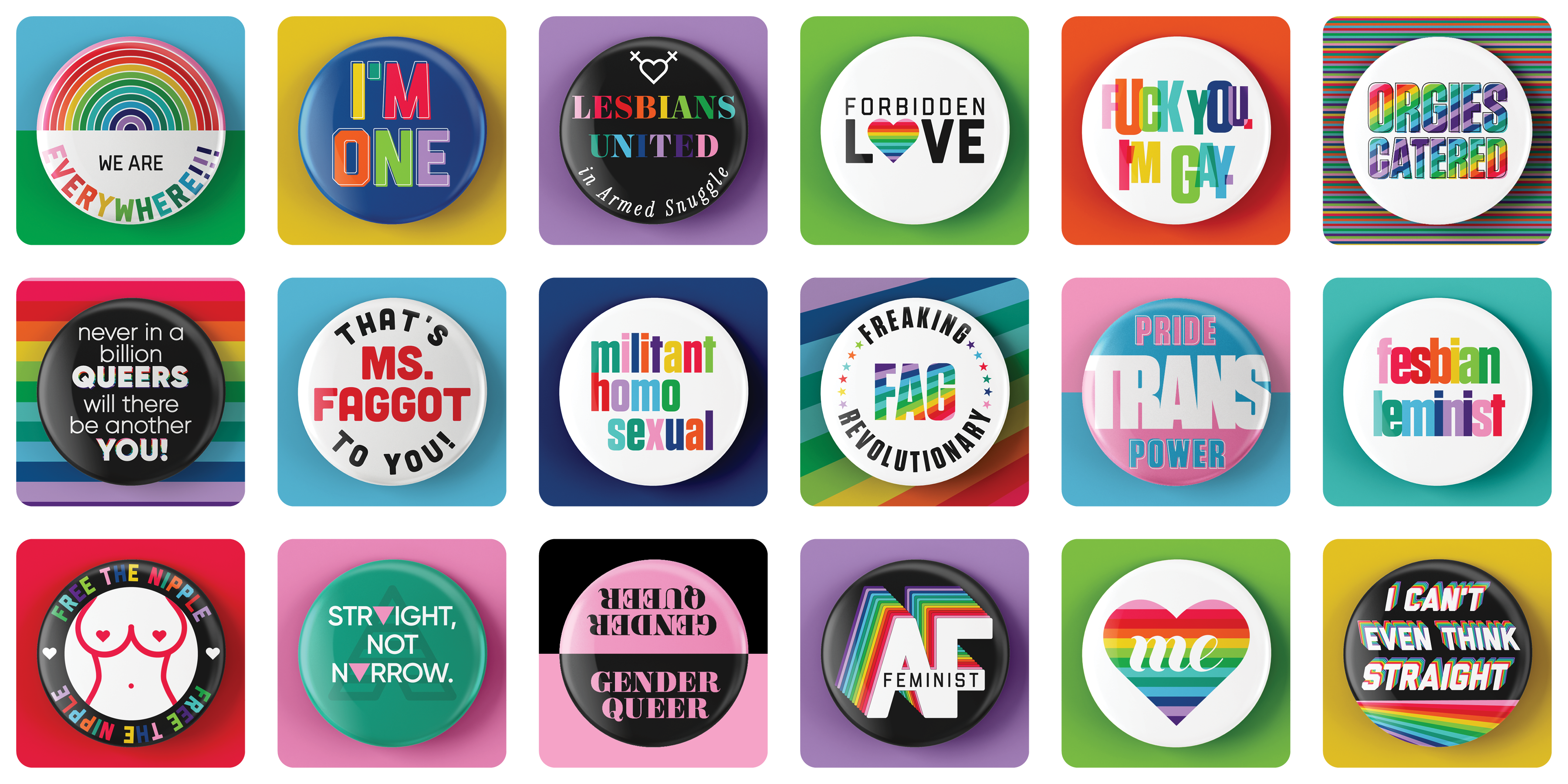 Our collection of wildly colorful buttons puts a playful spin on the loud and proud messages from the LGBTQIA+ Community’s fight for equality.